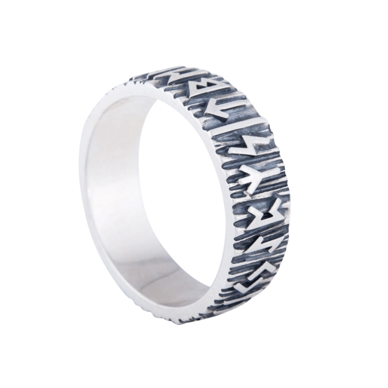 Embody this dual essence of destiny and creation with this exquisite sterling silver ring, adorned with the full array of Viking runes.
