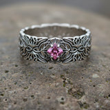 This Gold Triquetra Wedding Ring with Garnet is a rich expression of unity and devotion, inspired by ancient Celtic and Norse symbolism. The triquetra represents the eternal connection of past, present, and future, making it a meaningful symbol of lifelong commitment.