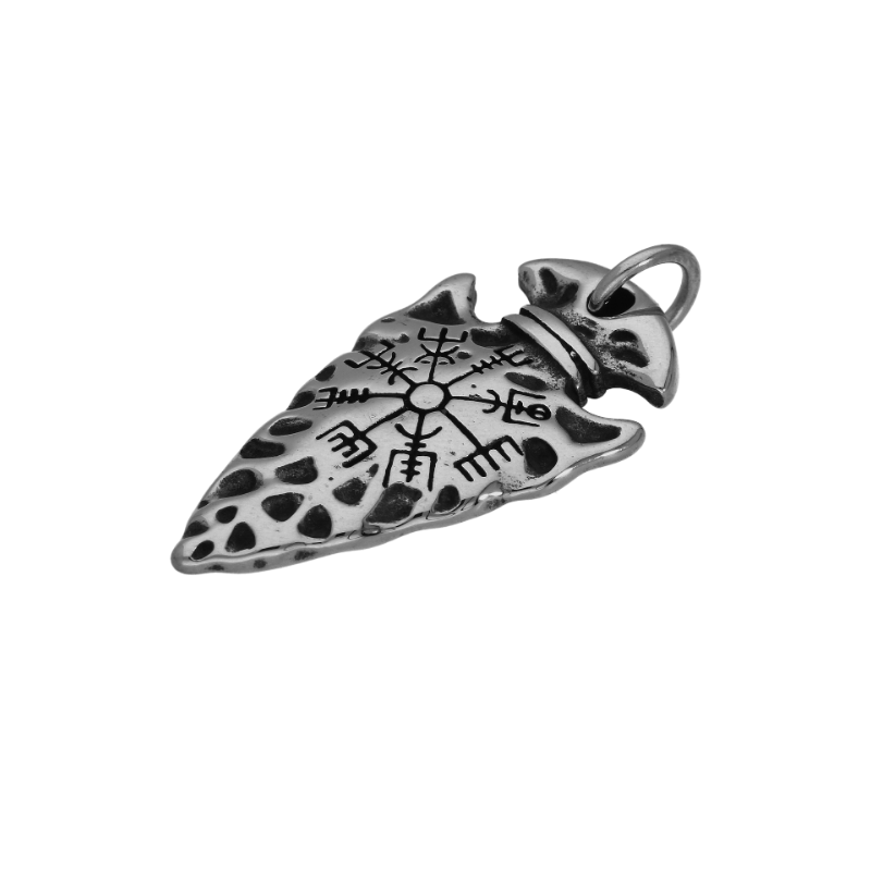 The spearhead of this stunning pendant is decorated with a magical runic stave known as Vegvisir.