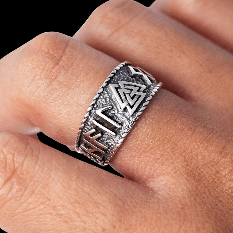 Show your own affinity to the Viking warrior mentality with this striking sterling silver ring that features both the Valknut, and the words "Hail Odin" in original Viking Younger Futhark runes.