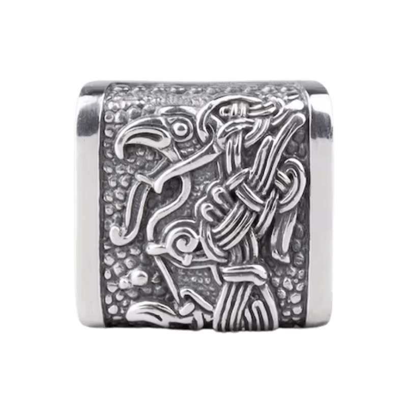 The side plates depict Huginn (Thought) and Muninn (Memory), the trusted ravens of Odin. These mystical creatures traverse the nine realms, gathering knowledge and whispering their secrets into the ear of the Allfather.