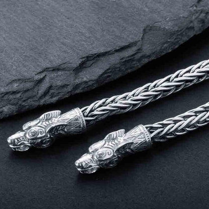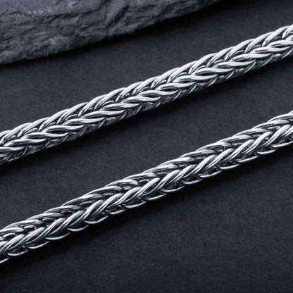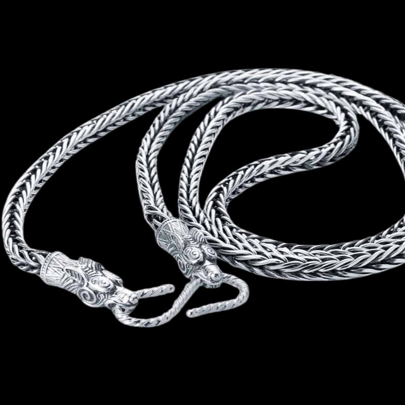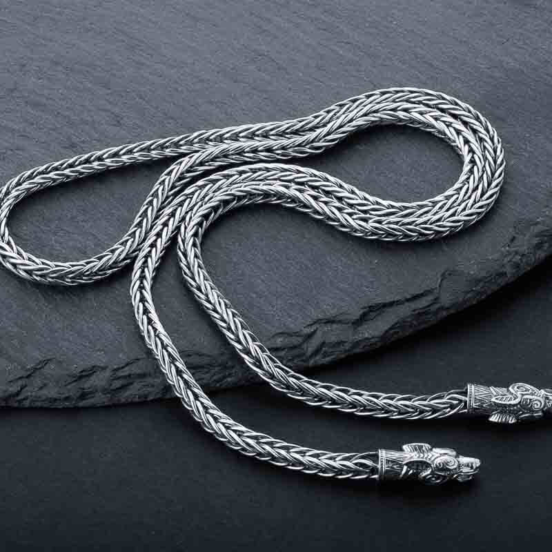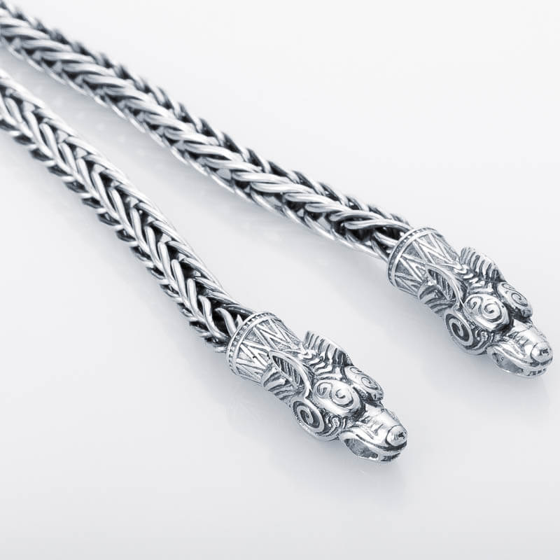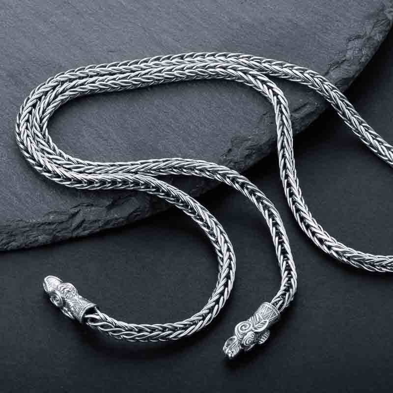 The wheat chain, with its intricate pattern, resembles the golden fields of the Norse heartlands, a symbol of prosperity and wealth. This sterling silver chain, culminating in finely detailed wolf heads, channels the spirit of the Viking era, where wolves were revered for their cunning and ties to the divine.