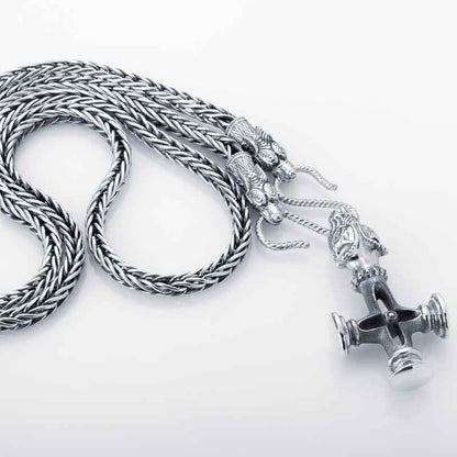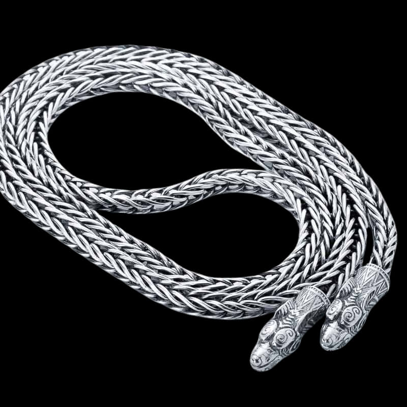 Each wolf head is not only a protector but also a guide, reflecting the belief that the wolf was an animal of Odin, leading souls to their rightful afterlife. This chain is more than jewelry; it is a companion that whispers tales of ancient forests, fjords, and the sagas of yore.