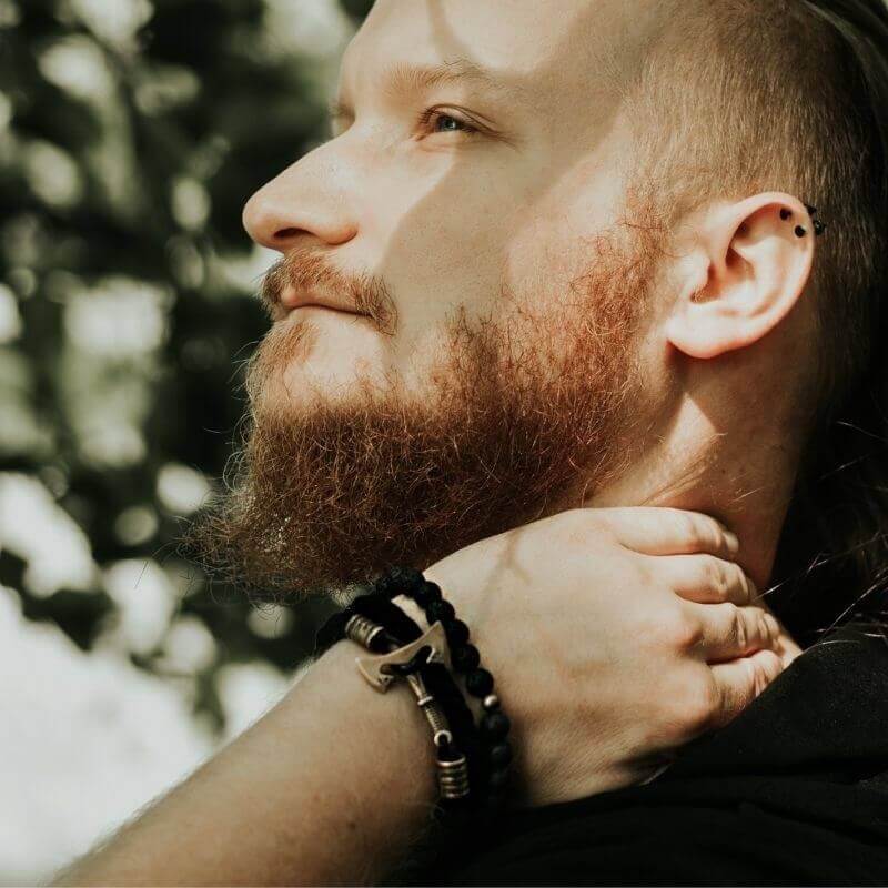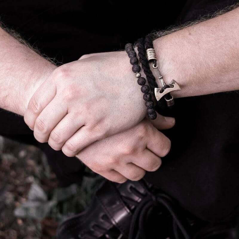 The Kjeld Bracelet is a bold statement of heritage, its intertwined cotton and lava stones a testament to the Viking legacy.