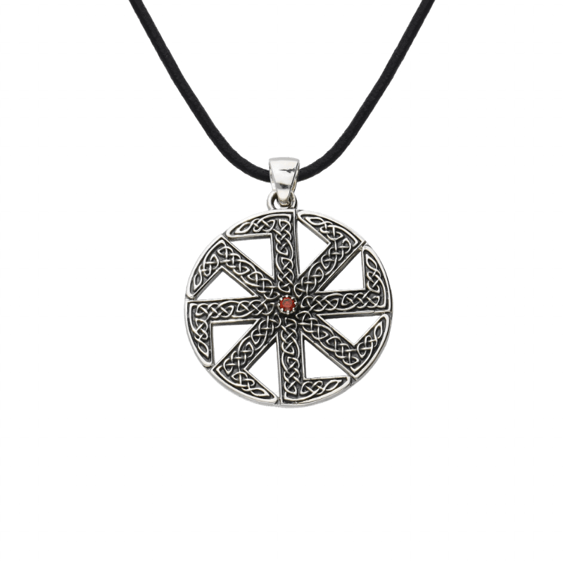 This sterling silver pendant features the Kolovrat surrounded by intricate Viking knotwork, a perfect fusion of Slavic and Norse traditions.