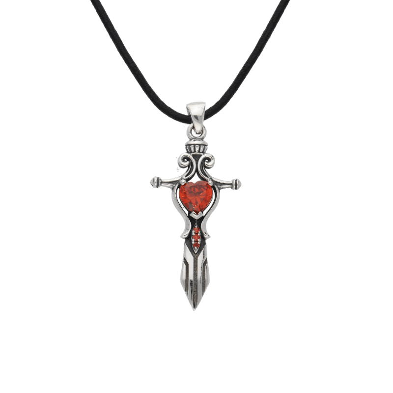 Handcrafted Norse Sword Red Cubic Heart Zirconia Sterling Silver Pendant