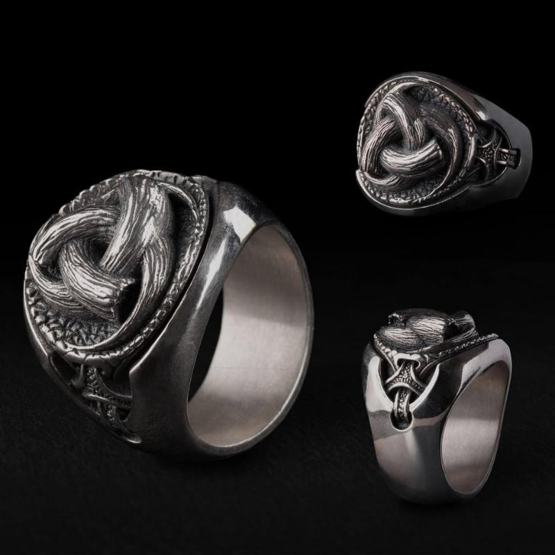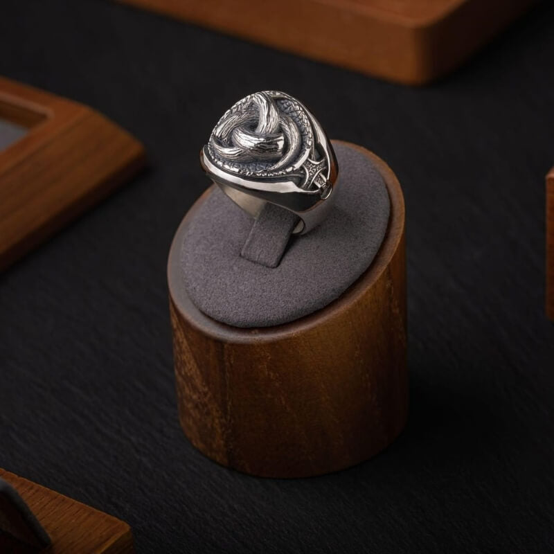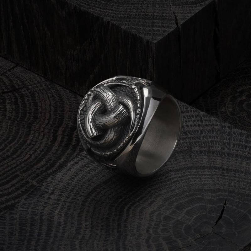 The Three Interlocking Drinking Horns are an emblem of the all-encompassing knowledge sought by Odin, the principal deity revered for both war and wisdom. This sterling silver ring captures the essence of Odin's relentless quest for the Mead of Poetry, symbolizing the depths of commitment to the pursuit of knowledge and mastery of language.