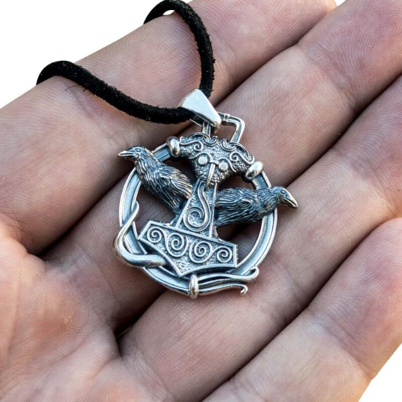 Handcrafted Thors Hammer Two Ravens Sterling Silver Pendant