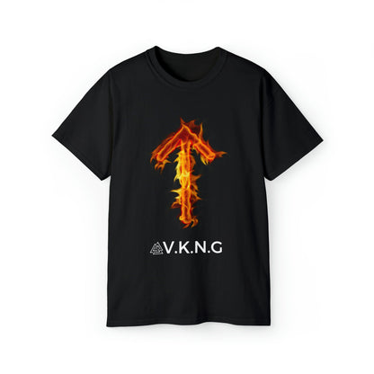 The Tiwaz Flaming Rune V.K.N.G™ T-shirt is not just a fashion statement; it's a profound connection to Norse mythology and its venerable traditions. Emblazoned with the Tiwaz rune, which corresponds to the 'T' sound in the Younger Futhark alphabet, this t-shirt represents a sacred symbol associated with the Norse god Tyr.