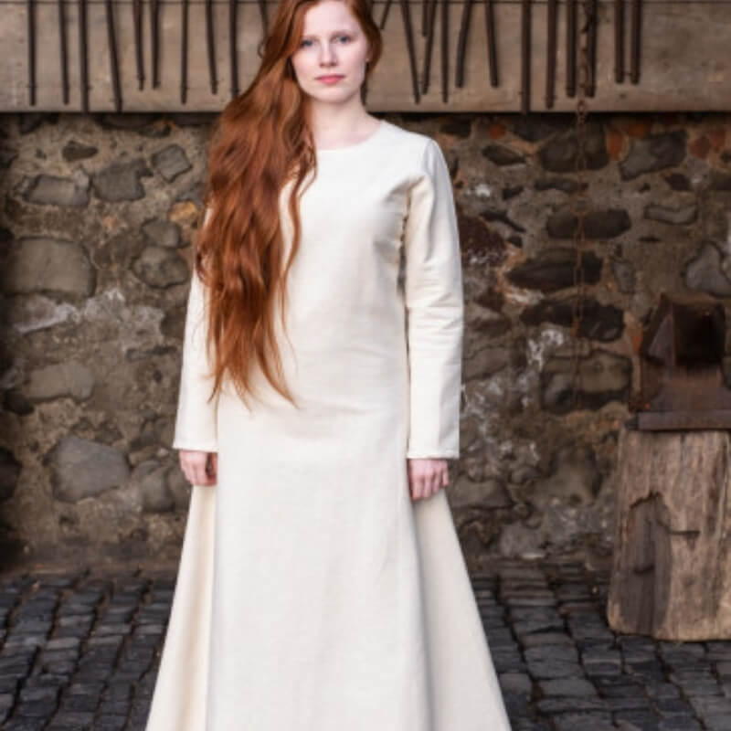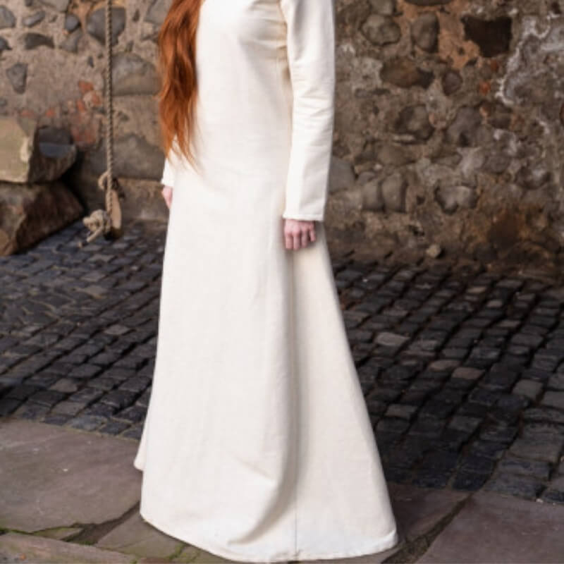 Made of heavy, unkempt cotton, it mirrors the garments worn by Viking women to endure the elements. The long sleeves and ankle-length cut offer full protection from the cold, while the round neckline ensures comfort and flexibility.
