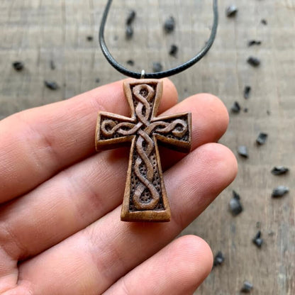 This walnut wood cross pendant features intricate Celtic knot designs, inspired by Viking artistry and craftsmanship.