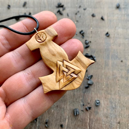 • Unique pendant combining Mjolnir and Odin's Horns, hand-carved from olive wood