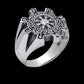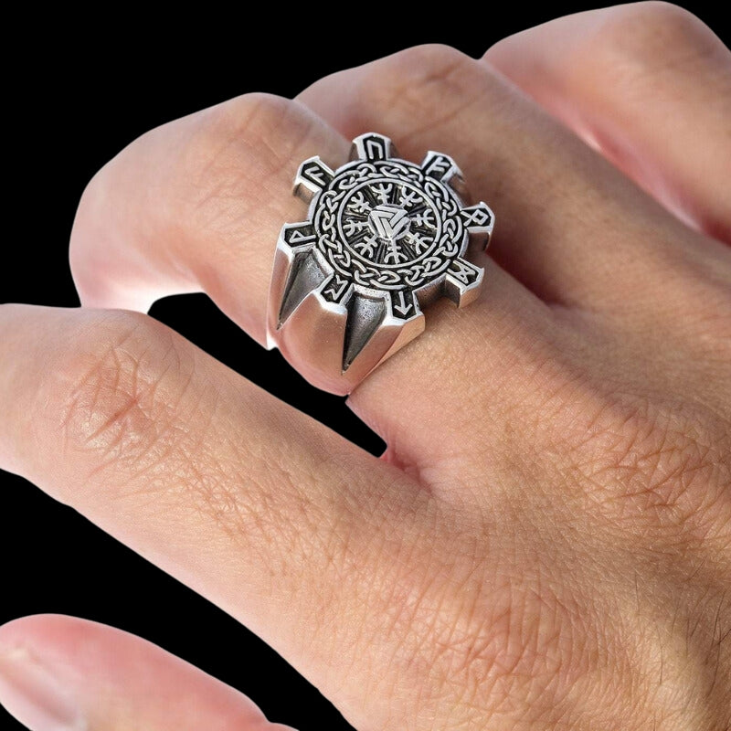 Encircled by the Helm of Awe, a protective stave believed to imbue the bearer with courage and Odin's favor, this ring is a fortress of ancient magic on your finger. Its perimeter is adorned with a sophisticated geometric pattern, reminiscent of Viking artistry, and inscribed with runes that exalt "Hail Odin".