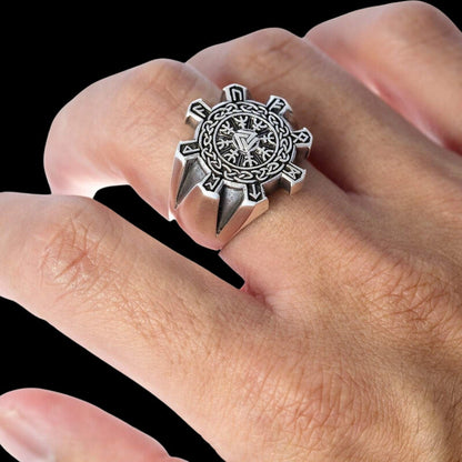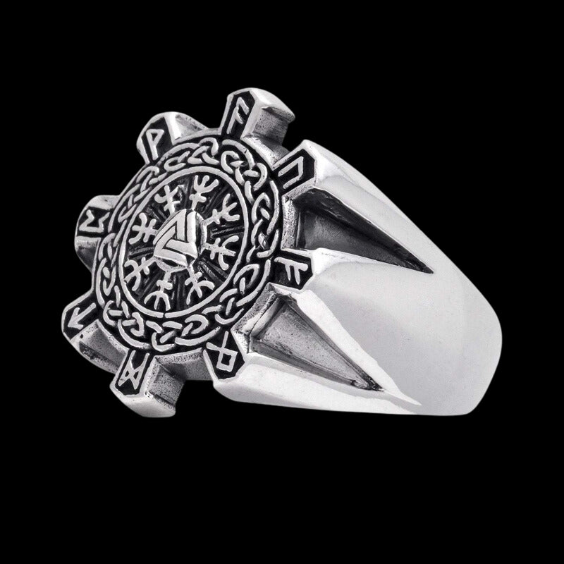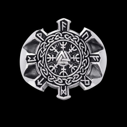 Embodying the fearless spirit of Viking warriors, the Valknut Aegishjalmur Sterling Silver Ring is a masterful tribute to the mighty god Odin. At its heart lies the Valknut, the esteemed symbol of Valhalla, encapsulating the unwavering bravery that defined the Norsemen.