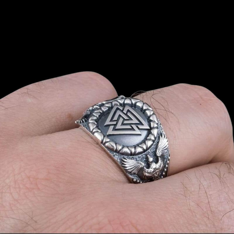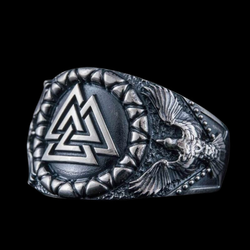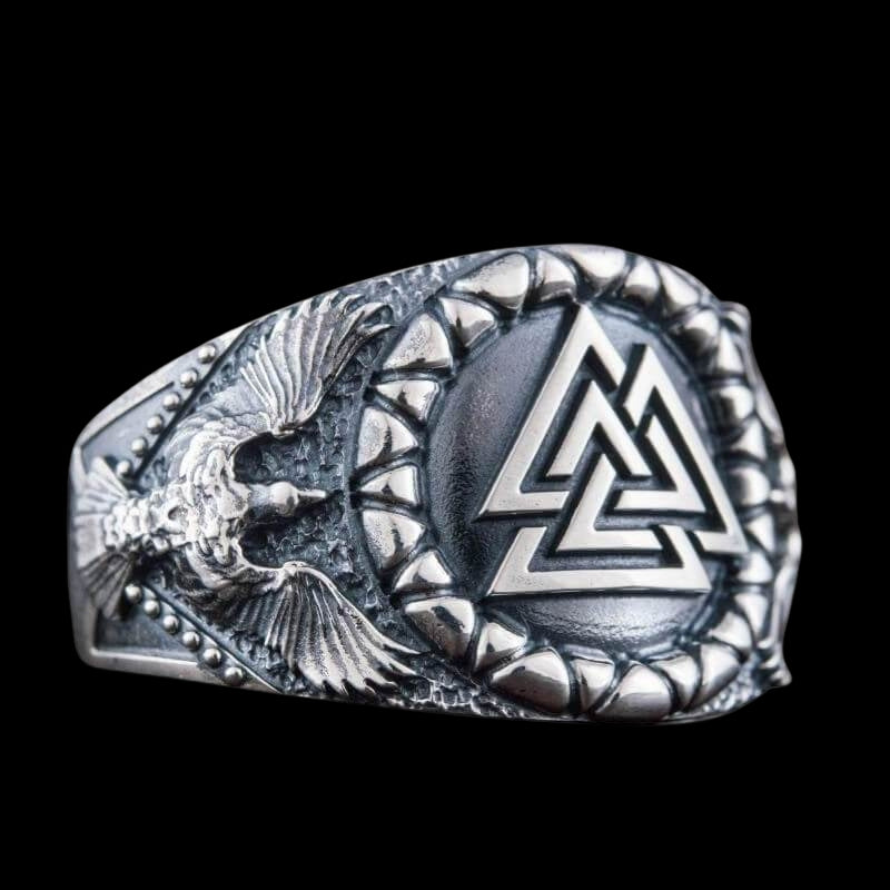 Handcrafted Valknut Symbol Raven Style Sterling Silver Ring