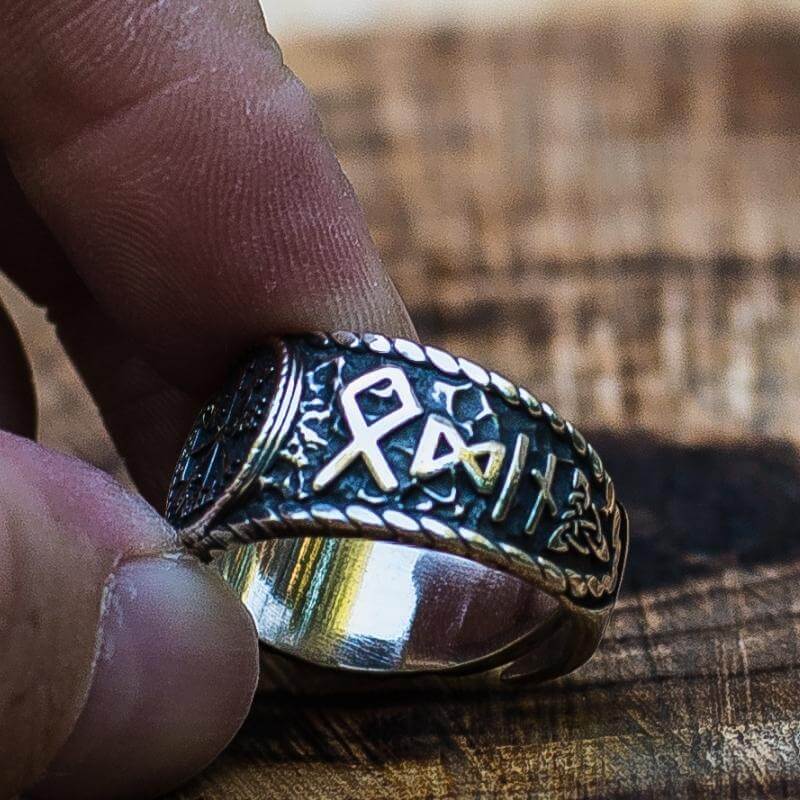 Vegvisir, the Norse Compass atop this ring, promises its wearer unfailing direction, symbolizing a steadfast guide through all manner of journeys.