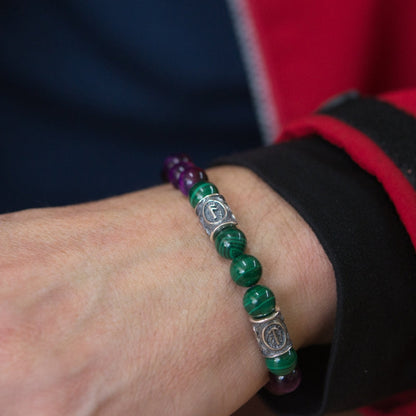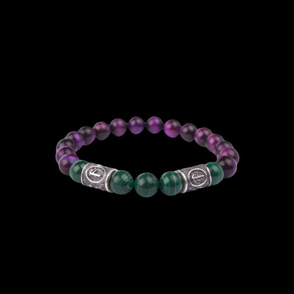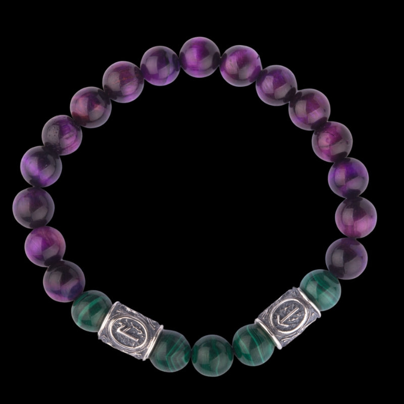 Viking Bracelet In Malachite And Purple Cat’s Eye with Double Rune Beads