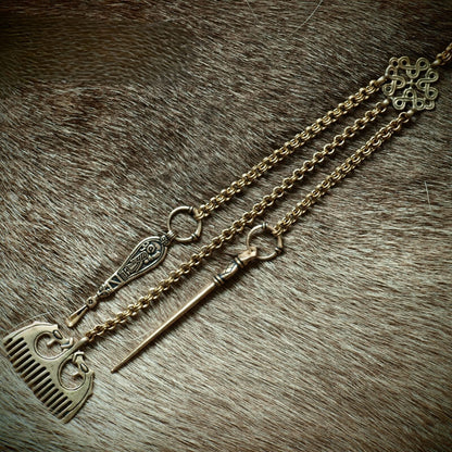 In a world where personal adornments and utility were intimately linked, this set served not just as a testament to the wearer's status but also as essential tools for personal grooming. The Vikings valued cleanliness and personal care, and this set is a nod to those practices, elegantly crafted in brass to stand the test of time.