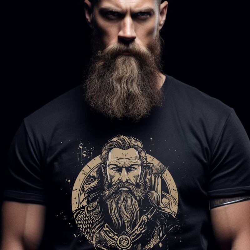 Featuring a design that evokes the Viking era, this T-shirt is more than just apparel; it's a narrative of battles, sagas, and mythologies. It embodies the spirit of Viking heroes, echoing their epic quests and unyielding resolve. The intricate design elements resonate with the rich history and the powerful tales that surround these ancient warriors.