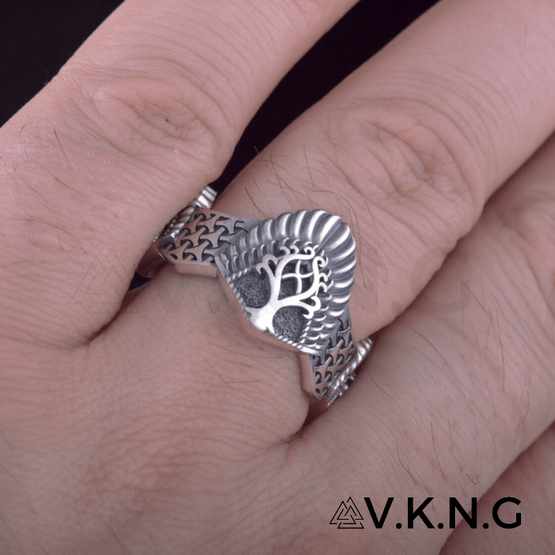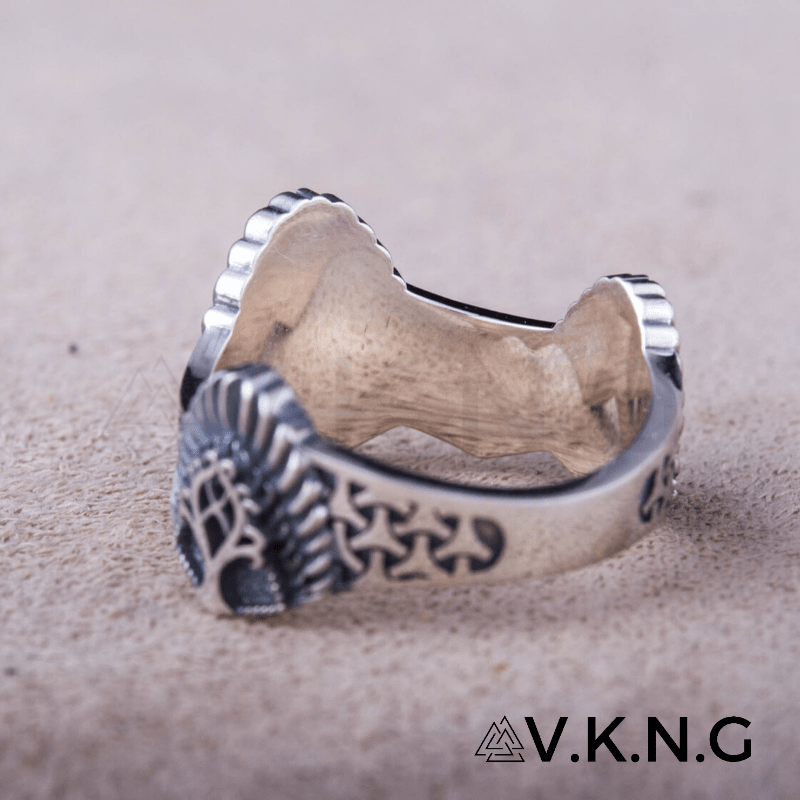 Living at the heart of Yggdrasil are the Norns, the shapers of destiny, who carve the fates of men into its bark, signifying the tree's role not just as a giver of life but also as a guardian of fate. The ring’s design, featuring Yggdrasil on three sides, envelops the wearer in the tree's mighty embrace, offering a continuous reminder of the flow of life and the tapestry of the universe woven by the Norns.