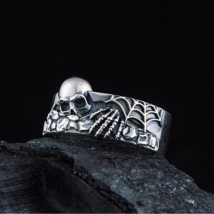 Anel de esqueleto assustador de prata 925 feito à mão para o Halloween, joias exclusivas