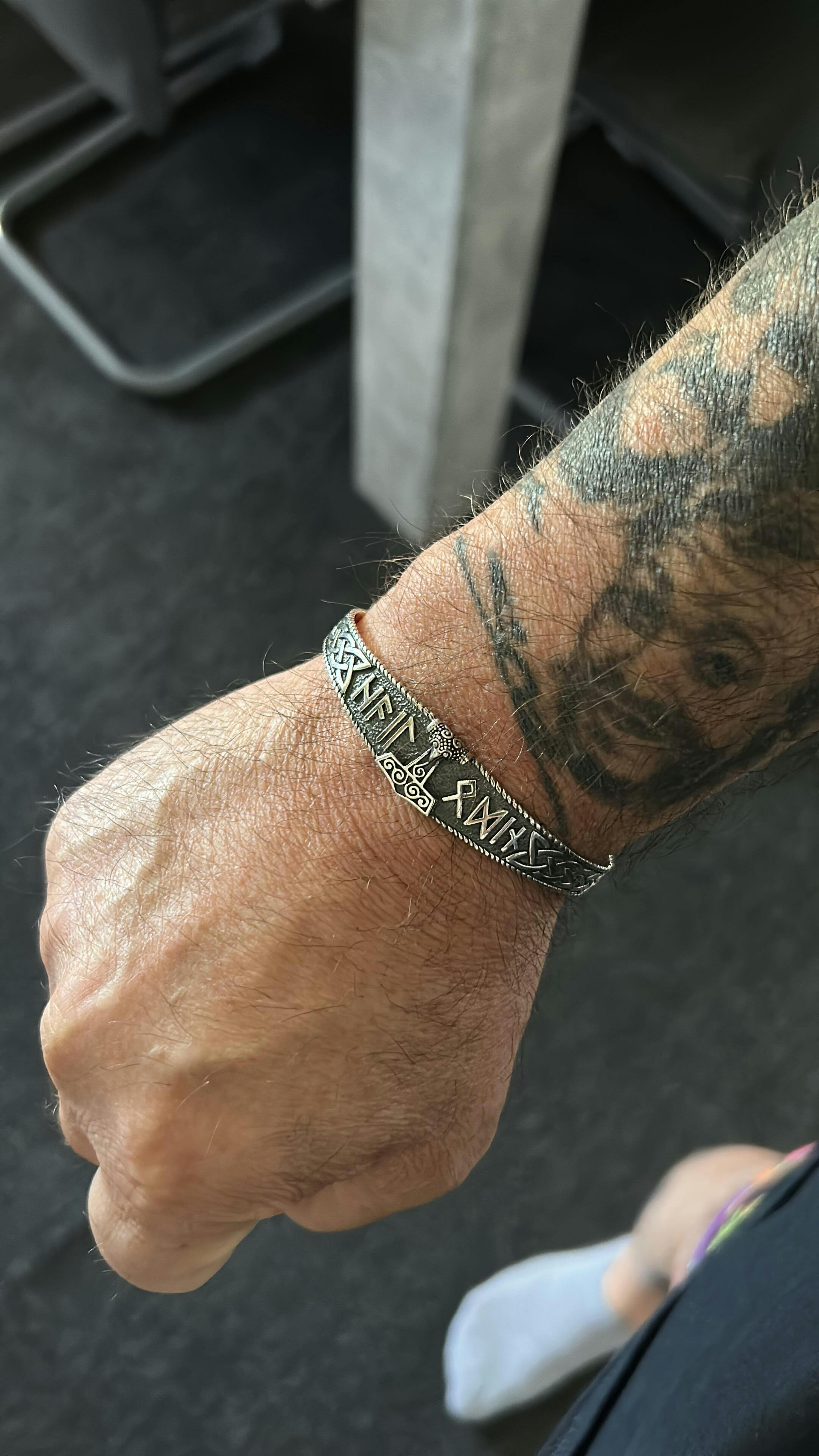 Mjolnir era o símbolo mais comum usado pelos vikings. O Martelo de Thor foi usado para invocar a proteção do deus que usa o martelo para proteger Asgard e Midgard contra as forças caóticas dos gigantes. Esta deslumbrante pulseira de prata esterlina combina um design clássico do Mjolnir com as runas Viking para as palavras "Hail Odin". Os vikings gritavam isso antes de entrar na batalha, pois Odin era o deus da guerra e só ele poderia garantir a vitória. Além disso, é Odin quem escolhe o mais bravo guerreiro caído para morar em Valhalla. Peça perfeita para o Viking moderno que quer homenagear Odin e Thor. Este bracelete foi projetado para ser flexível para que você possa abri-lo para colocá-lo e depois apertá-lo para apertá-lo no pulso. Não se surpreenda ao ouvir um estalo baixo, mas evite abrir e fechar excessivamente a pulseira.