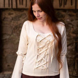 O laço da blusa é uma homenagem à habilidade nórdica no trabalho com nós, um detalhe que une quem a usa não apenas no tecido, mas também na herança. Com cada renda, a pessoa se aproxima do espírito das formidáveis donzelas-escudeiras, ecoando sua força e graça.