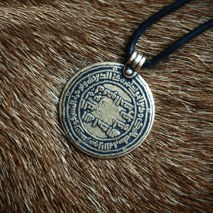 Tal como o original, o pingente Birka dirham tem um diâmetro de 2,8 cm e está disponível em bronze de alta qualidade (também disponível com acabamento prateado).