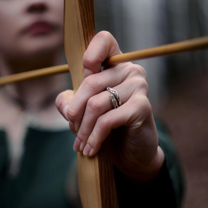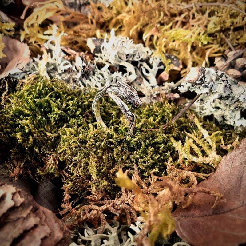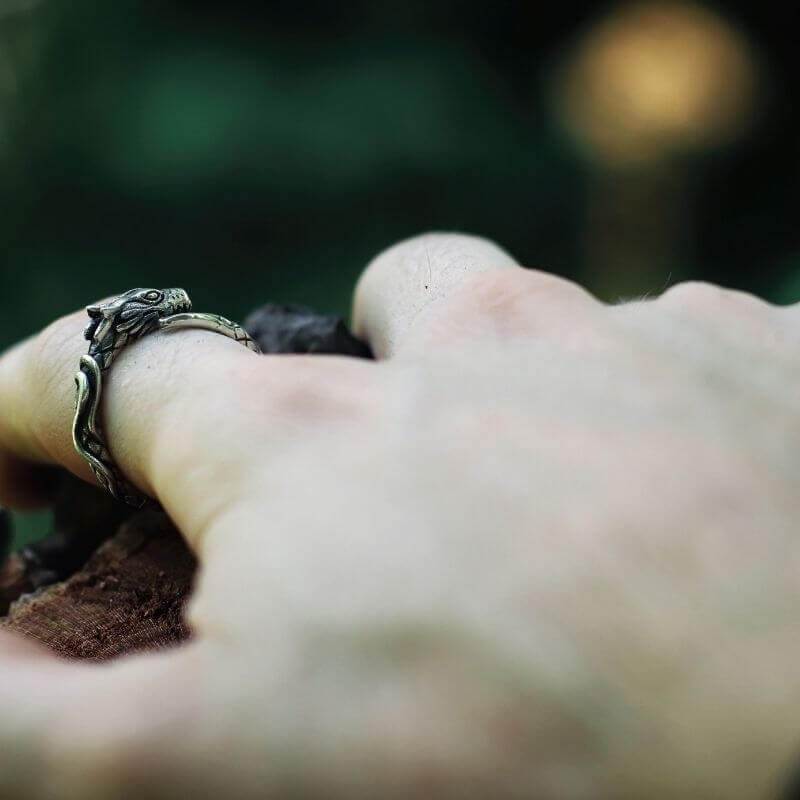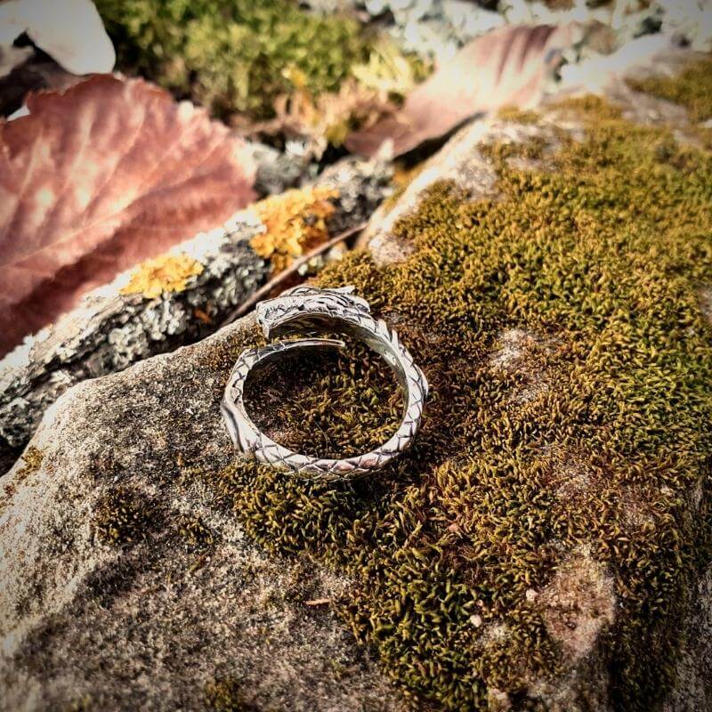 Jormungandr, a serpente que circunda o mundo, representa os medos finais que devem ser enfrentados. Diz-se que durante o Ragnarok, Jormungandr emergirá das profundezas para enfrentar Thor em uma batalha final, simbolizando o ciclo de luta e renascimento. O anel serve como um lembrete para enfrentarmos nossos medos, por mais assustadores que pareçam.