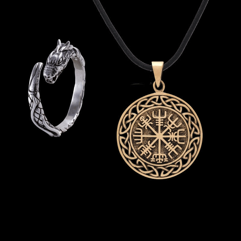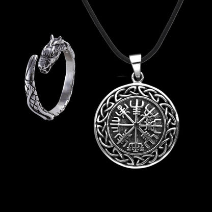 • O conjunto de presente inclui anel Jormungandr de prata e pingente Vegvisir