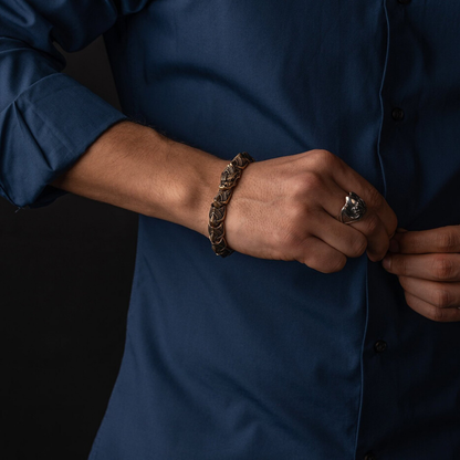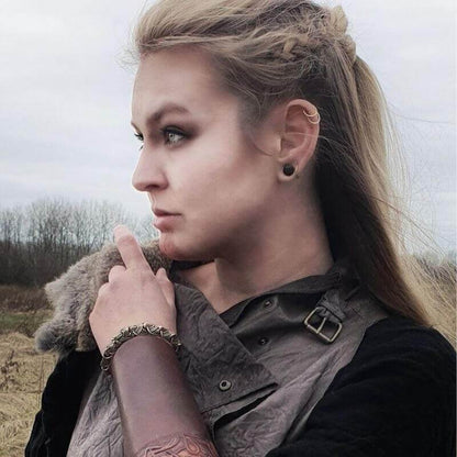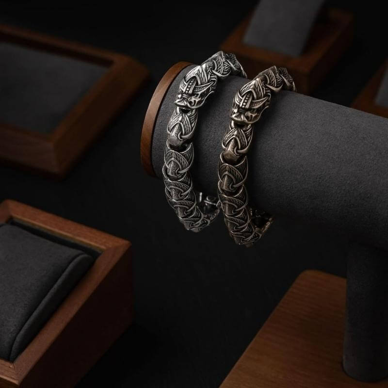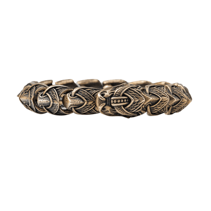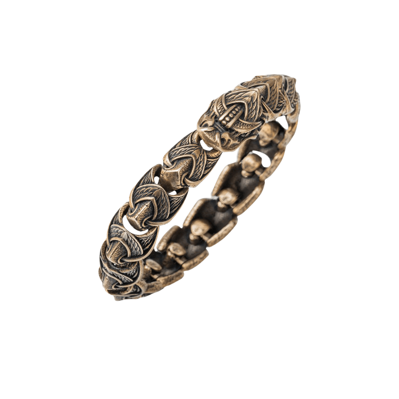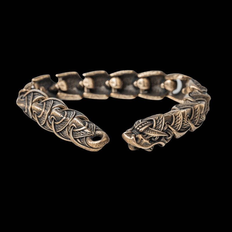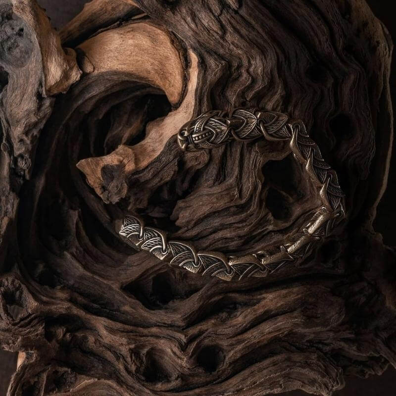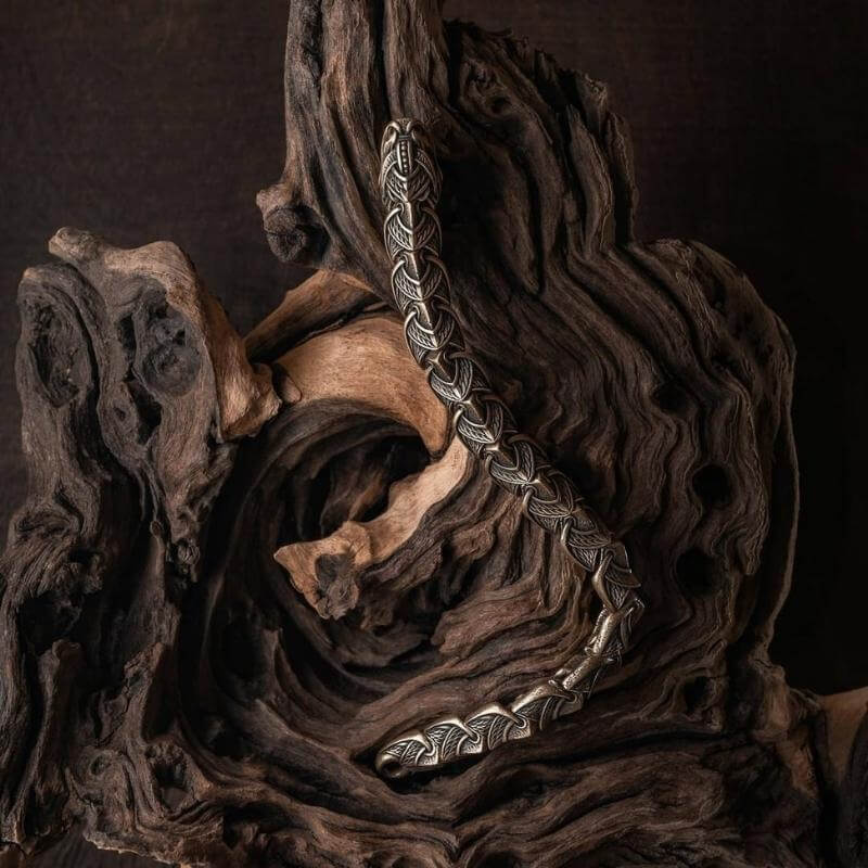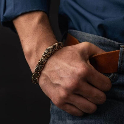 Abrace a essência da lenda nórdica com a pulseira Jormungandr em bronze ou prata.