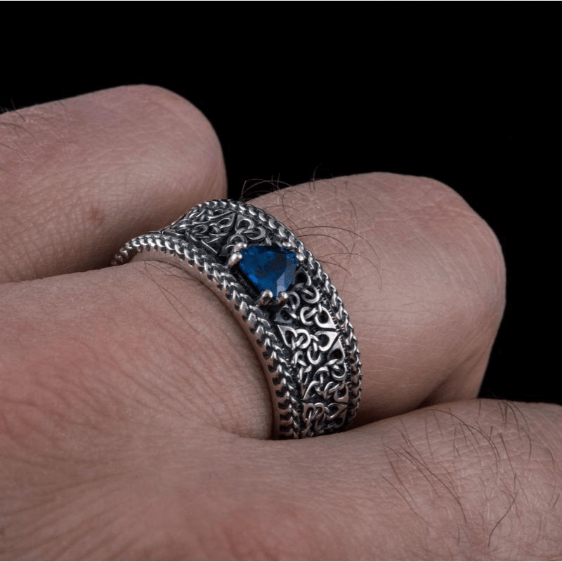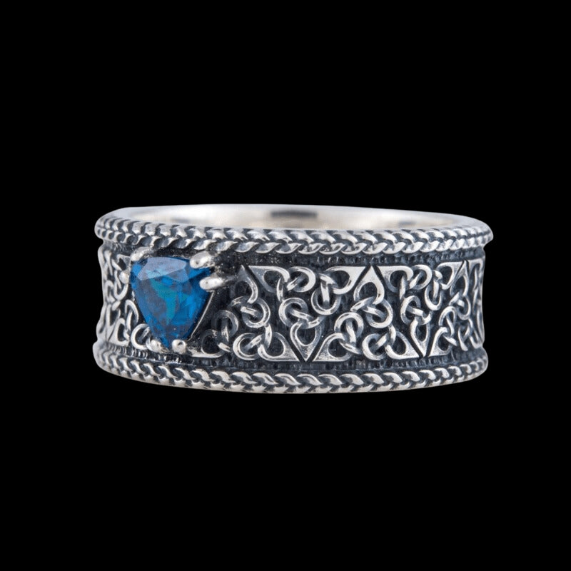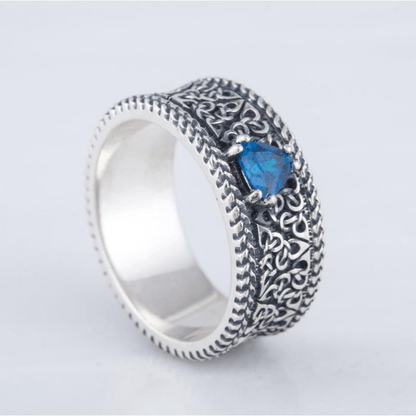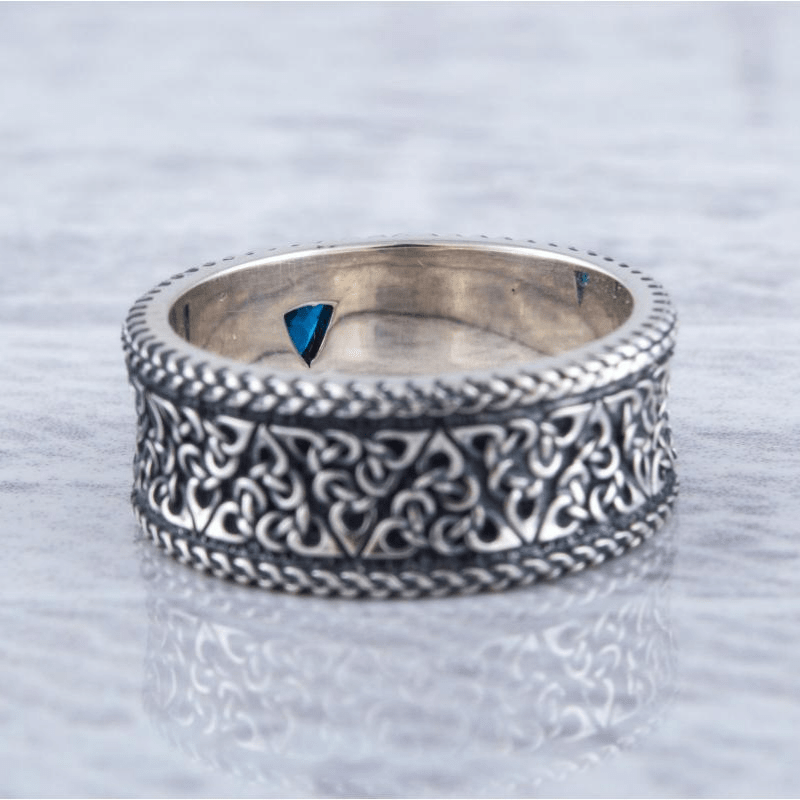 Este deslumbrante anel de prata esterlina utiliza estilos de design vikingos tradicionais de formas feitas a partir de uma única linha interconectada. Essas linhas formam uma série de triquetras, um símbolo comum em toda a Europa. Embora o significado do símbolo no período viking seja desconhecido, ele pode ter estado associado à magia Seidr. Certamente se tornou um símbolo do paganismo moderno e da bruxaria. Este anel intricadamente projetado com uma pequena joia azul é perfeito para os vikings pagãos modernos.