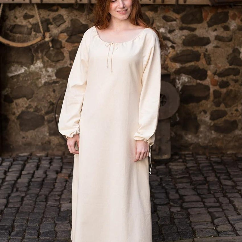 O Under Dress Annecke Natural é uma peça atemporal, pensada para quem aprecia a elegância e simplicidade das vestimentas clássicas medievais. Feito de algodão branco natural, este vestido apresenta um design em formato de A que embeleza a figura, tornando-o perfeito para usar sozinho ou por baixo de outros vestidos.