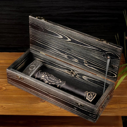 Pesando pouco menos de 4 libras, é perfeitamente equilibrado para presença e exibição, mas forjado com o mesmo cuidado de uma arma feita para a batalha. Seja para exibi-lo como uma declaração de fé nos antigos deuses ou carregá-lo como um lembrete de força e resiliência, este martelo é mais que simbólico, é um eco vivo da maestria viking.