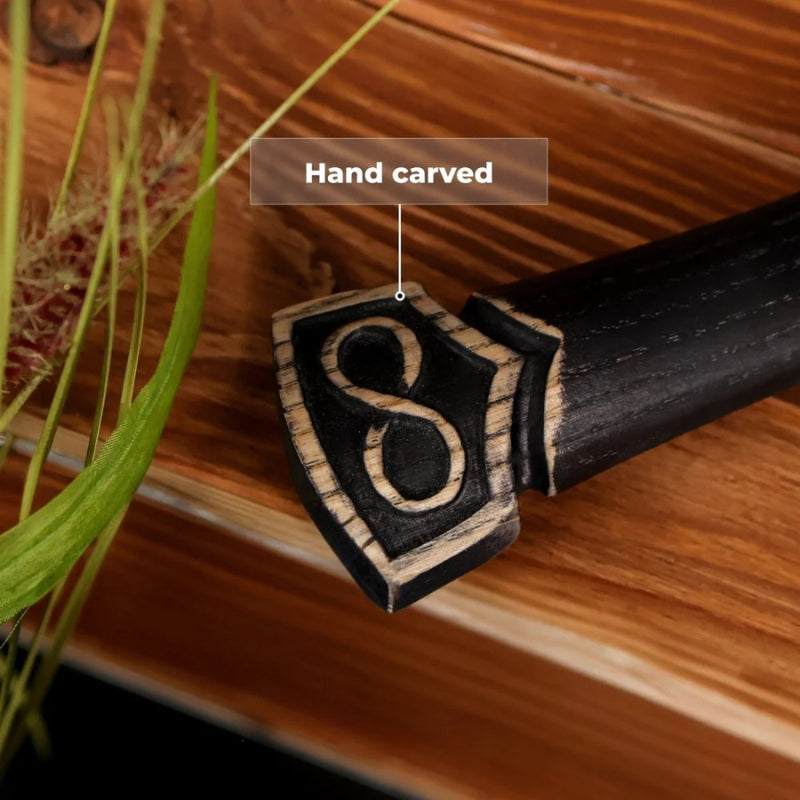 O cabo, esculpido em madeira de freixo, não é apenas uma empunhadura. É uma homenagem, com o próprio Odin imortalizado em suas curvas, capturando a essência da narrativa do velho mundo e da runologia.