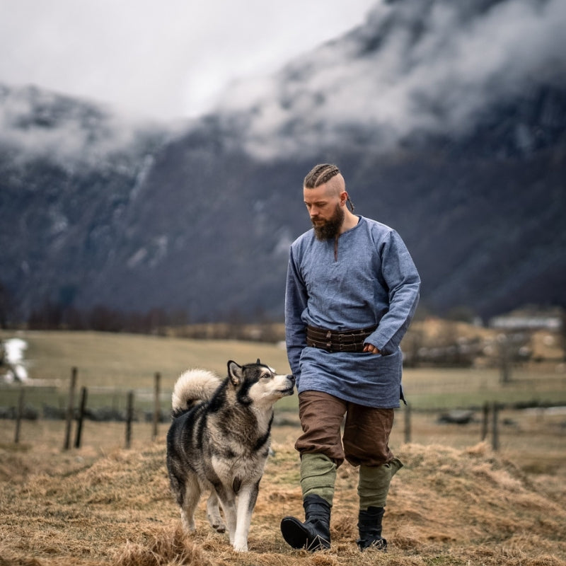 A túnica viking "Torsten" em azul-acinzentado é projetada para aqueles que procuram um estilo viking autêntico e robusto. Inspirada em vestuários históricos do início da Idade Média, esta túnica reflete a roupa simples, mas funcional, usada tanto por guerreiros como por colonos vikings.