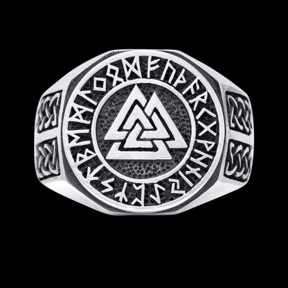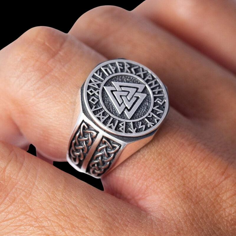 Este anel, feito com maestria, combina o poderoso símbolo Valknut com os místicos alfabetos rúnicos – cada runa é um legado da sabedoria de Odin. Rodeado por um labirinto de nós, uma marca registrada da arte Viking, este anel é uma prova do espírito Viking de coragem e da busca incansável pelo destino.