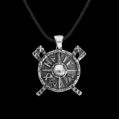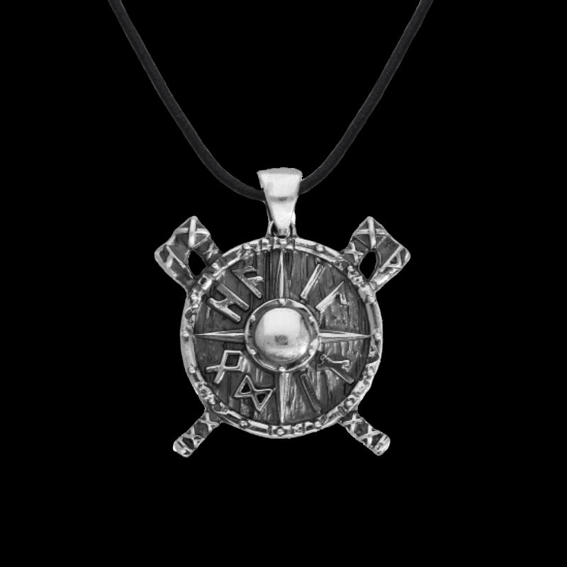 Este pendente em prata esterlina finamente trabalhado incorpora esse espírito guerreiro. Dois machados de batalha cruzam-se atrás de um escudo redondo viking, a primeira linha de defesa em combate. O próprio escudo é adornado com gravações de pontas de lança e runes que soletram "Saudações a Odin", invocando a proteção e o poder dos deuses nórdicos.