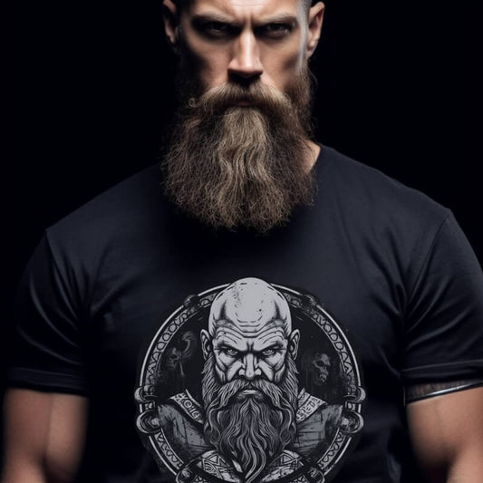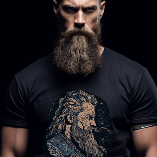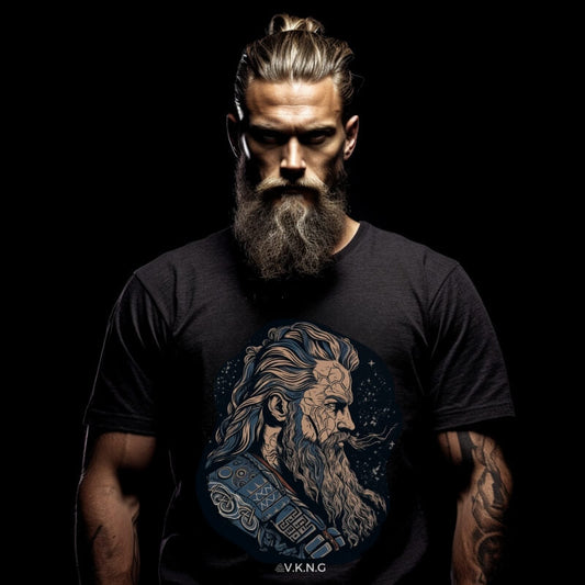 Vår Vandraren Odin t-shirten visar guden i hans skepnad som vandraren, som överger sin plats i Asgard för att utforska universum. Han håller i en stav och Yggdrasil, världsträdet, sträcker sig upp bakom honom. Oden hängde sig från Yggdrasil i nio dagar och nätter genomborrad av sitt eget spjut för att lära sig runornas hemligheter. Spjutet syns i bakgrunden. Två korpar är också synliga nära toppen av bilden. Dessa är Huginn (tanke) och Muninn (minne), som varje dag skulle flyga ut i världen och berätta för guden allt som de såg.