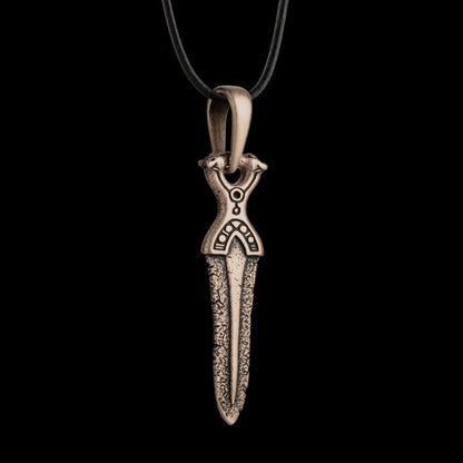 Den handgjorda dolken med björnhuvuden Berserker-hänget är inte bara ett tillbehör; det är en symbol djupt rotad i den rika gobelängen av vikingahistoria och nordisk mytologi. Denna utsökta pjäs, handgjord i fin brons, hämtar inspiration från bersärkarna - krigare som är legendariska för att gå in i striden i ett frenetiskt trans, kanalisera björnens råa kraft och grymhet. Hängets design, med björnhuvuden på fästet av ett vikingasvärd, återspeglar den transformativa styrka dessa krigare sökte genom sin gemenskap med björnandan, en totem av tapperhet och oöverträffad kraft i den nordiska kulturen.