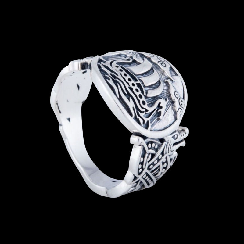 Denna ring i sterling silver fångar essensen av Drakkar, som ligger i den utsmyckade Borre-stilen som blomstrade på 1000-talet. Designen hyllar vikingarnas konstnärliga och marina prestationer, som representerar ett drakförsett skepp som kunde ha uppfattats som en monstruös havsdjur som närmade sig.