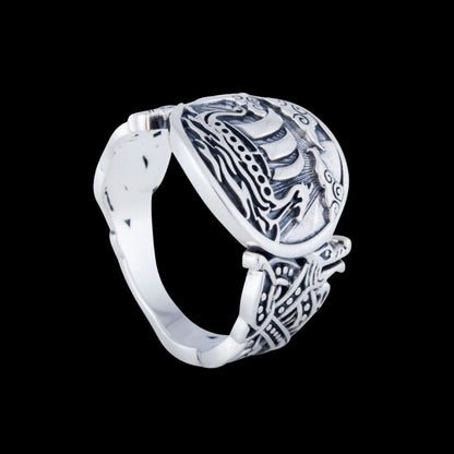 Handgjord Drakkar-symbol med Wolf Ornament Sterling Silver Ring