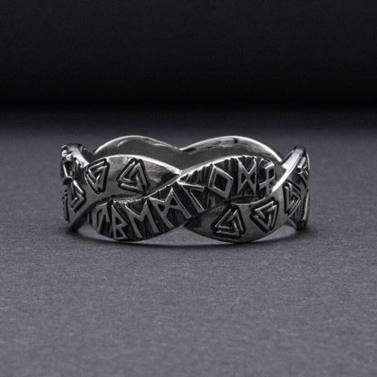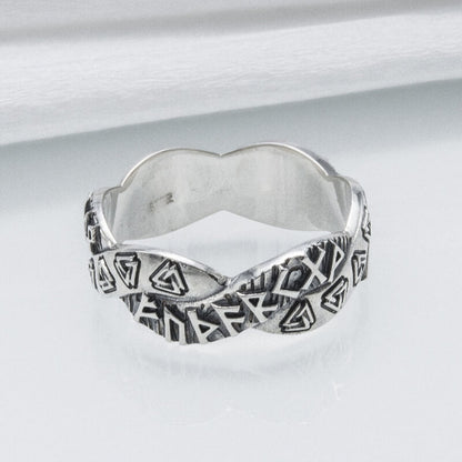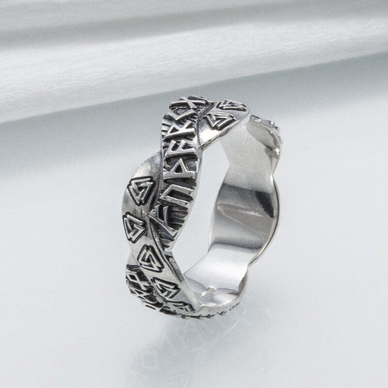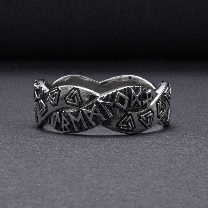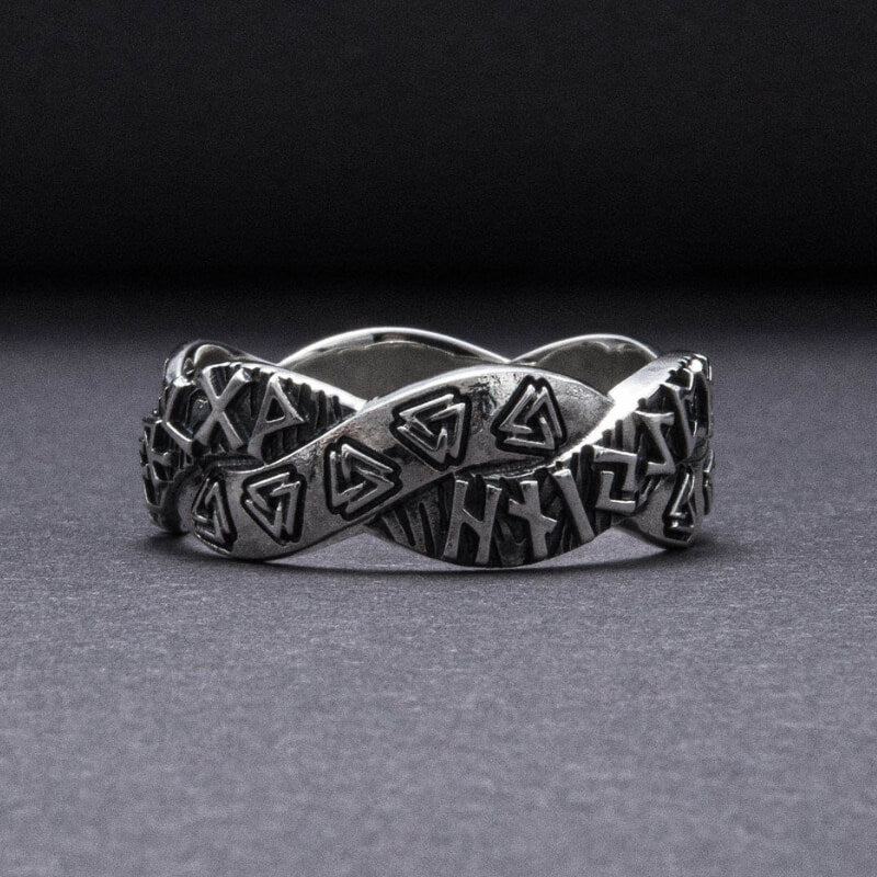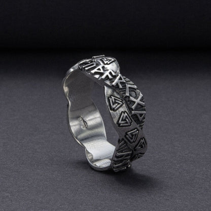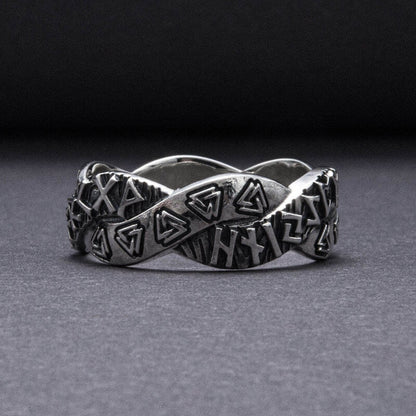 De äldre Futhark-runorna krusar över bandet, var och en en viskning från det förflutna, som berättar berättelser om ära och ödets eviga dans. När du sätter den här ringen på ditt finger förbinder du dig med de uråldriga energierna i det nordiska kosmos, ett arv som tiden inte kan erodera.