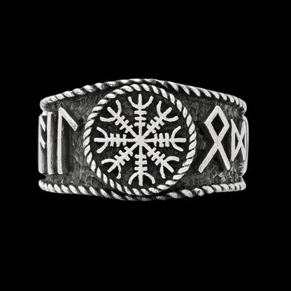 Att bära denna ring kopplar dig till de kraftfulla traditionerna hos vikingarna, och åkallar skydd, mod och magin från runorna. Tillverkad i fint 925 Sterling Silver, är det ett smycke för dem som omfamnar styrkan och mysteriet i den nordiska arvet.