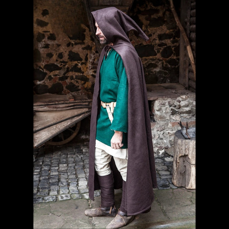 Tillverkad av tung ullfilt, erbjuder denna kappa både värme och hållbarhet, vilket gör den till en oumbärlig följeslagare för äventyrare som står inför bitande vindar eller plötsligt regn. Den spetsiga huvan ger en touch av medeltida stil samtidigt som den skyddar mot väder och vind.