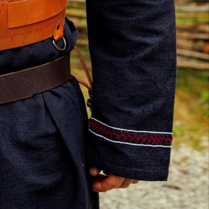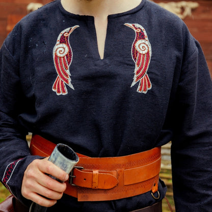 I nordisk mytologi är Hugin och Munin Odins två korpar, som flyger över världen för att föra honom nyheter om allt de ser och hör. Denna tunika, prydd med figurerna av dessa två mytiska fåglar, hyllar Allfaderns ständiga strävan efter kunskap och visdom.