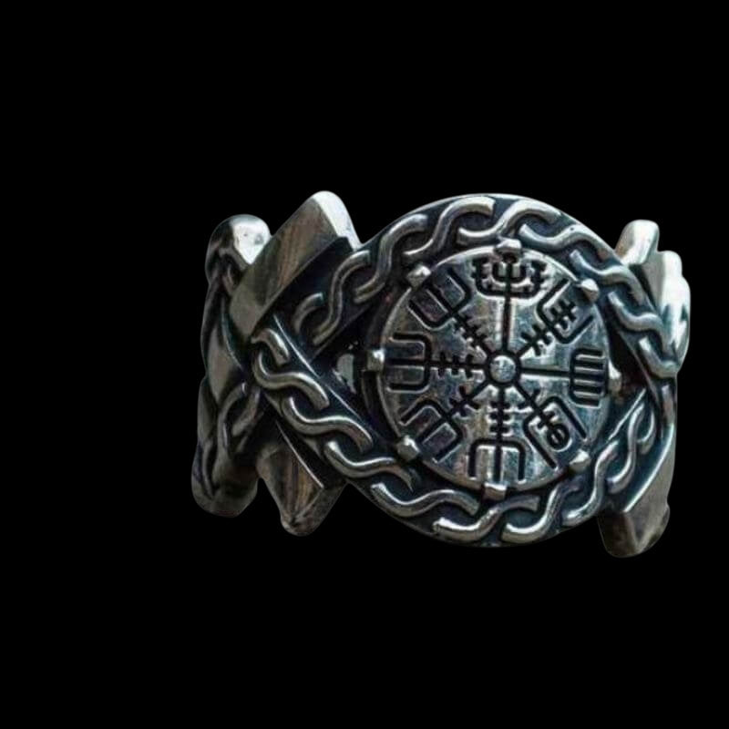 Denna handgjorda ring i sterlingsilver har Vegvisir djupt inristad i ett robust band, vilket speglar styrkan och motståndskraften i vikingarnas anda.