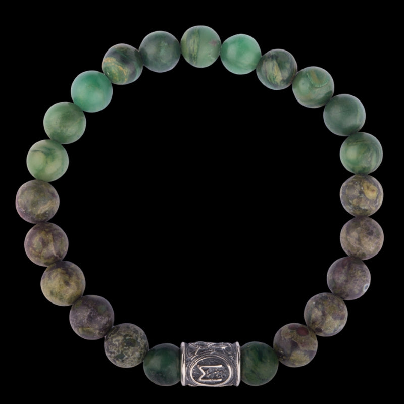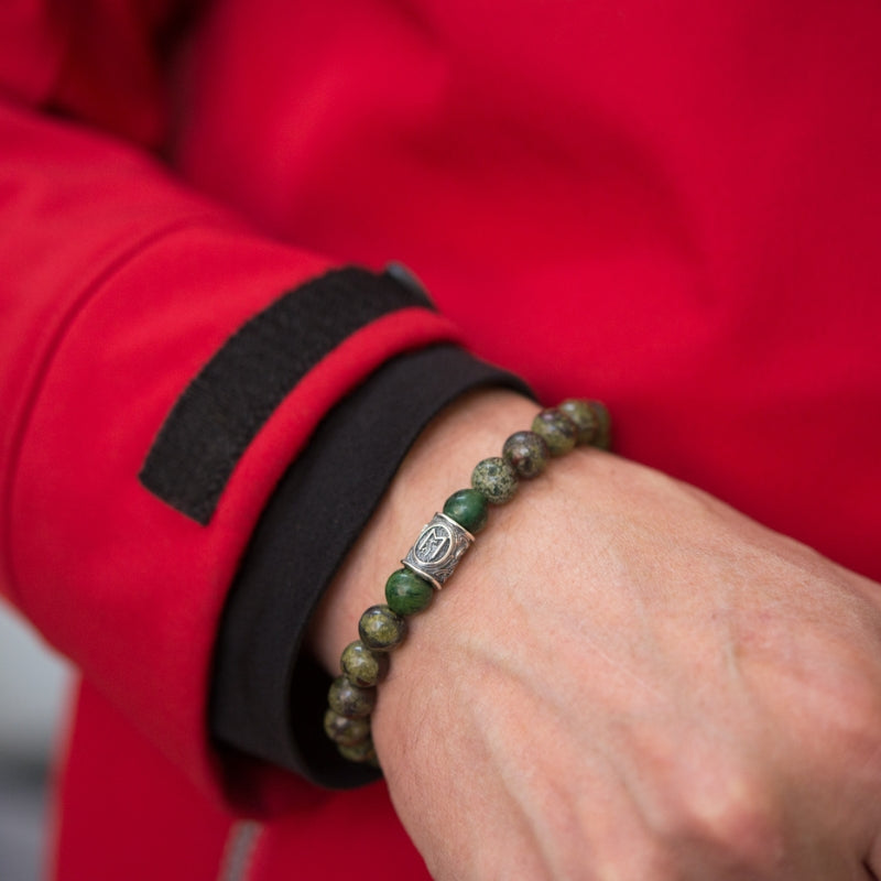 Bär detta armband som en symbol för skydd, inre styrka och vikingasjäl, förankrad i energierna från nephrit och jasper.